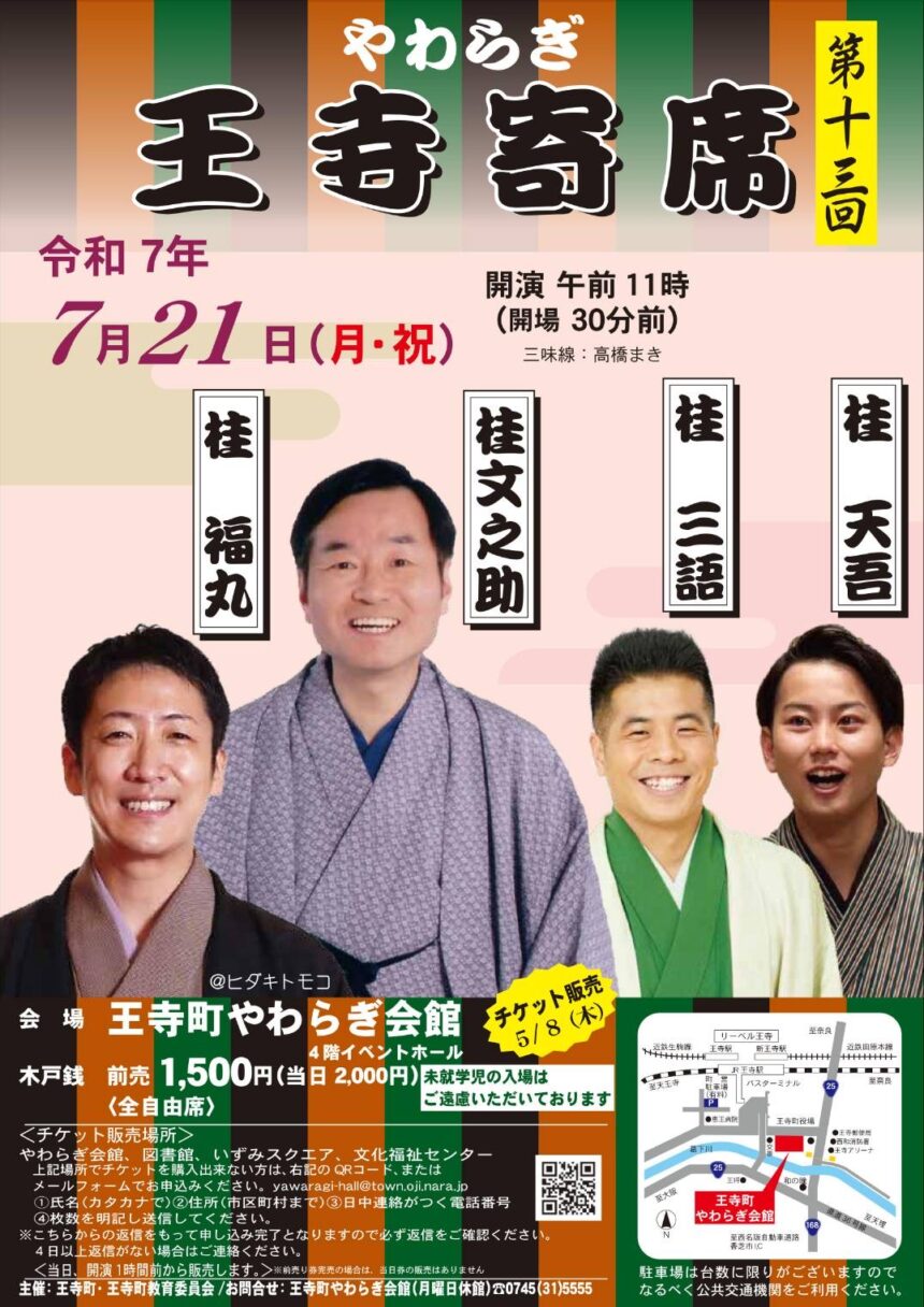 2025.07.12(土) 7月21日(月・祝)『第13回 やわらぎ王寺寄席』に出演します。 #公演情報 日時 7月21日(月祝) 開演11時00分(開場10時30分) 会場 王寺町やわらぎ会館 4階イベントホール 出演 桂文之助、桂福丸、桂三語、桂天吾 チケット情報 全席自由 前売1,500円/当日2,000円 お問い合わせ 王寺町やわらぎ会館/王寺町 この情報をSNSでシェアする お知らせ一覧へ