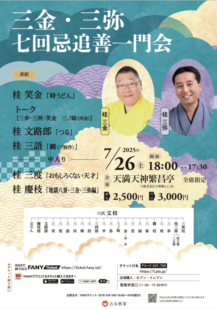 2025.07.16(水) 7月26日(土)『三金・三弥 七回忌追善一門会』開催します。 #公演情報 日時 7月26日(土) 18時00開演(17時30分開場) 会場 天満天神繁昌亭 出演 桂三金・桂三弥 桂笑金「時うどん」/【トーク】桂三歩 桂三河 桂笑金 (司会)桂三ノ助/桂文路郎「つる」/桂三語「鯛(三枝 作)」~仲入~桂三度「おもしろくない天才」/桂慶枝「地獄八景・三金・三弥編」 チケット情報 全席指定:前売2,500円/当日3,000円 お問い合わせチケットぴあ この情報をSNSでシェアする お知らせ一覧へ